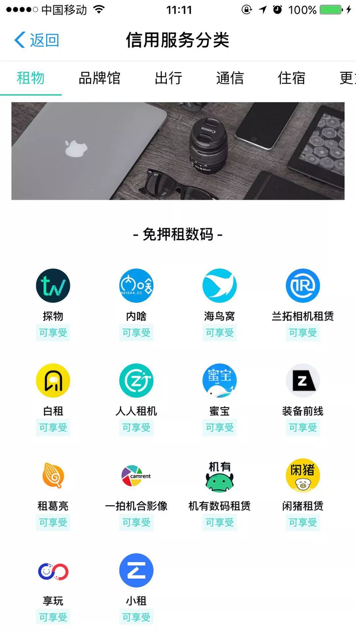 芝麻信用的免押金借物服务,现在覆盖的商品类型逐渐丰富起来了。