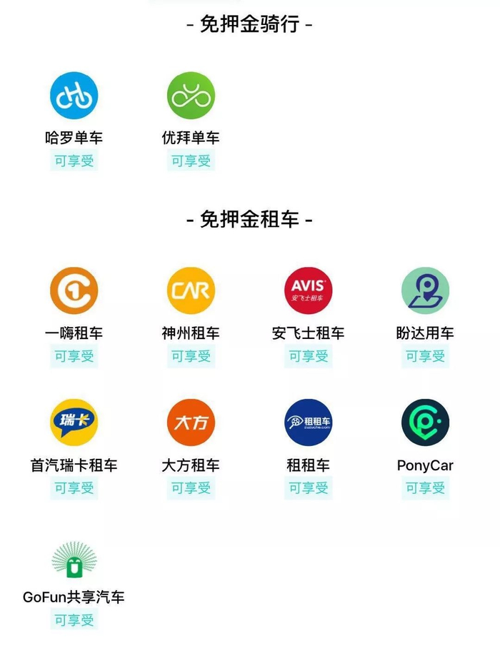 在信用生活的出行专区,可以看到还有免押金骑行、租车等信用服务。