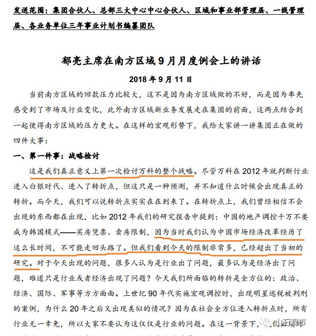 郁亮在万科南方区域月度例会上讲话,真正意义上第一次检讨万科的整个战略,以“活下去” 为最终目标。