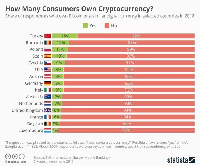 Statista数据显示,2018年全球拥有加密货币最多的国家排名中,土耳其和罗马尼亚名列第一名和第二名,各有18%和12%的受访民众表示自己拥有加密货币。而这两个国家都是本国财政陷入危机,法币动荡甚至大幅贬值的国家代表。2018年8月12日土耳其里拉对美元汇率暴跌17%,跟年初相比累计跌幅已高达近40%。罗马尼亚近年政治社会动荡加剧,陷入贸易赤字危机。2018年1-7月,罗马尼亚贸易赤字高达75.8亿欧元,同比增长11%。2017年全年罗马尼亚列伊对欧元的贬值幅度达3%,2018年该指标将继续恶化。