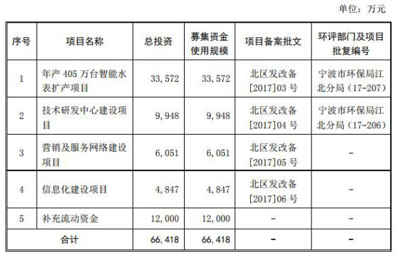 宁波水表的募集资金拟用于年产 405 万台智能水表扩产项目、技术研发中心建设项目、营销及服务网络建设项目、信息化建设项目和补充流动资金。