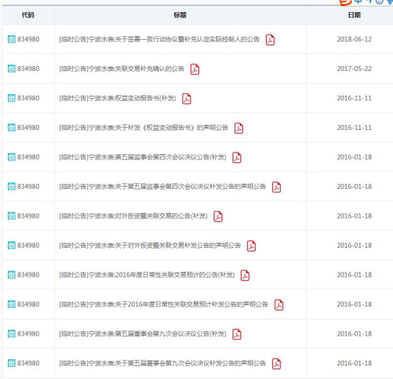 通过查询发现,自挂牌以来,宁波水表共发布了12个补充公告,涉及日常关联交易、董事会决议、补充认定实际控制人等方面。