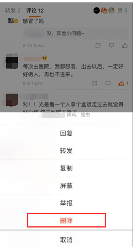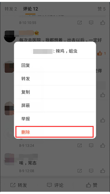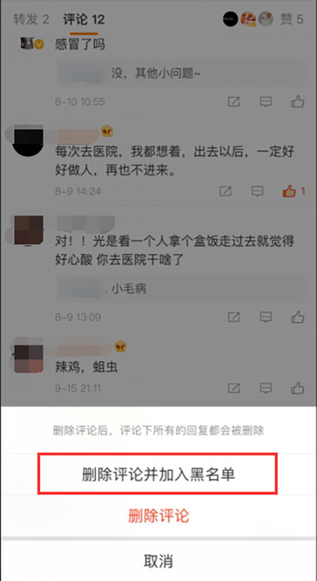 · 删除评论并拉黑操作步骤:微博正文页评论列表—选择评论—删除—删除评论并拉黑