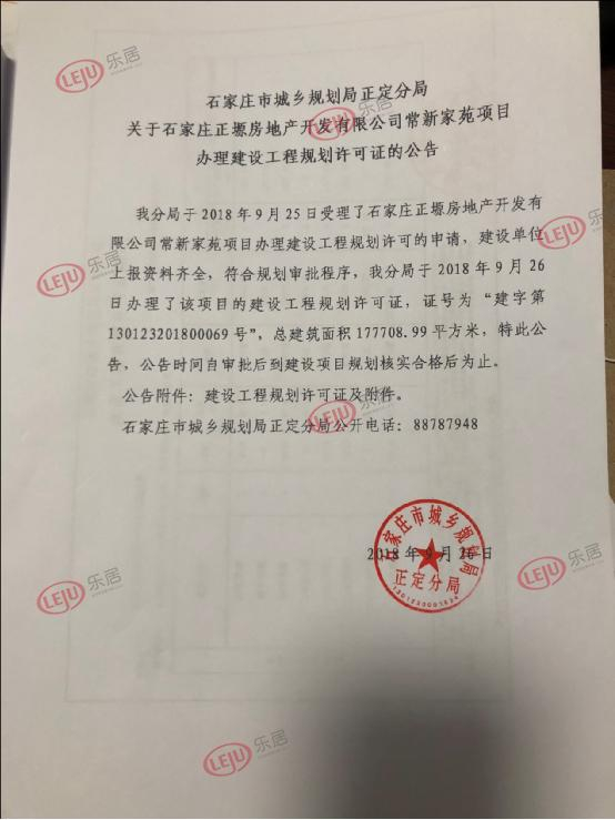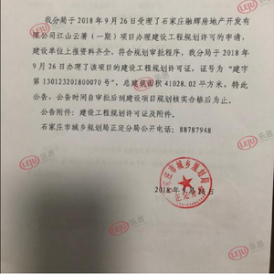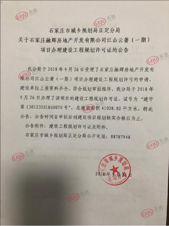 近日,新浪乐居于正定县人民政府网站了解到,石家庄融辉房地产有限公司江山云著(一期)项目以及石家庄正塬房地产开发有限公司常新家苑项目新获建设工程规划许可证。许可证号分别为“建字第130123201800070号”和“建字第130123201800069号”。