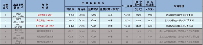 第2号宗地:世纪大道与宝山路交叉口西南侧,宗地号:3411020130040032000。出让面积103.41亩(68937㎡),规划用途为 居住、商业(3%-10%),容积率1.6-2.0,绿地率≥35%,建筑密度≤25%,建筑层数80米,出让年限70/40年,起拍价20690万元。起拍楼面价:1501元/㎡。
