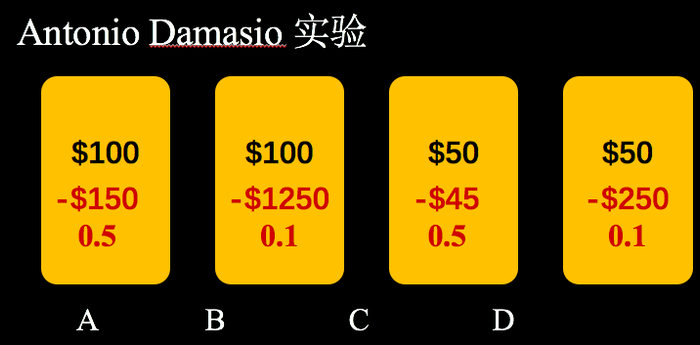 测试者并不知道这个情况,只知道自己要赢尽可能多的钱,于是开始随机摸牌。大概两、三次以后,他们心中就开始有一个感觉:AB这两种牌不太好,得摸C和D。