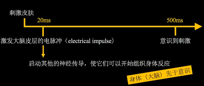 但同时在20ms的时候,这个电脉冲会刺激到周围的神经,于是开始组织身体的反应。因此,在20ms时,我们的身体就已经有反应了,但在500ms时才会意识到。