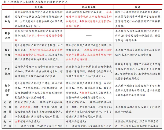 与征求意见稿相比,正式稿在理财产品投资范围、穿透管理和理财投资顾问管理等方面,进一步明确了相关要求,如明确在银行间市场发行的资产支持证券(包括ABN)属于理财产品投资范围;在流动性风险管理、压力测试和信息披露等方面,进一步区分公募和私募理财产品要求,与其他同类资管产品的监管标准保持一致;在私募理财产品销售方面,借鉴国内外通行做法,引入不少于24小时的投资冷静期要求。这与证监会私募资管业务中冷静期的安排保持一致。