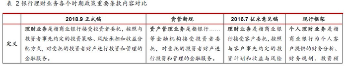 事件:2018年9月28日,银保监会正式发布《商业银行理财业务监督管理办法》(以下简称“理财新规”),同时发布相关部门负责人答记者问。在此之前,18年4月27日,《关于规范金融机构资产管理业务的指导意见》(“资管新规”)正式发布。之后为配合资管新规,银保监会于7月发布了《商业银行理财业务监督管理办法(征求意见稿)》(“理财新规征求意见稿”),于7月20日至8月19日向社会公开征求意见。理财新规正式稿的出台,意味着银行理财监管要求的具体细则已经比较确定,有利于消除市场的不确定性,稳定市场预期,推动银行理财业务规范发展和转型。