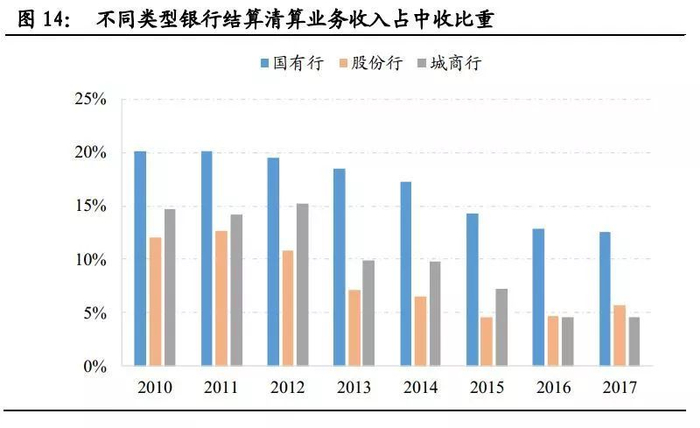由于结算清算业务需要全国乃至海外的网络和强大的基础设置来支持,因此一直以来是国有行中间业务收入的主要来源,此类业务市场格局也较为稳固。由于政府指导价的业务主要为结算类业务,因此在2013年后占比在不断下降。