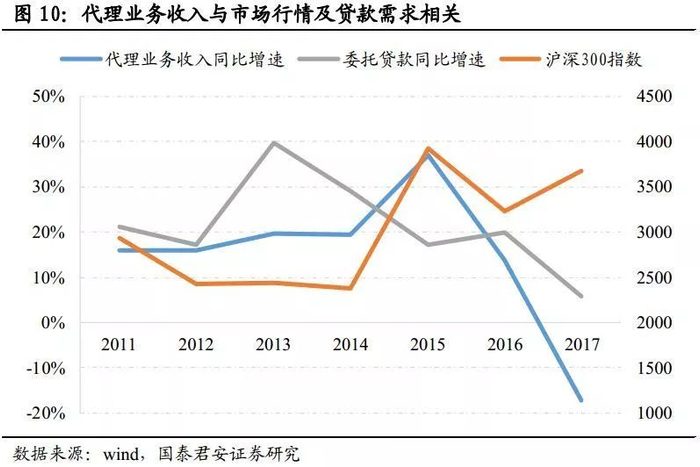 (2)增量则是指代理销售业务和委托贷款业务。由图可见,股票行情与代理业务收入的同比变动密切相关,行情好时,基金等产品也更好销售,此类业务收入相应快速增长。而金融杠杆去化导致委托贷款增速放缓,代理业务收入相应受到冲击。