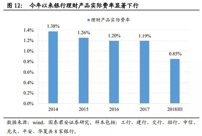 产品类型不同使得购买费率也有不同,目前银行理财产品固定收取的费率约在0.2%-1%/年的水平,但这没有考虑超过预期收益率的收入。我们根据老16家上市银行(除南京银行)表外理财收入/表外理财规模推算得知,18H1银行理财实际费率为0.76%(17H1为1.10%)。