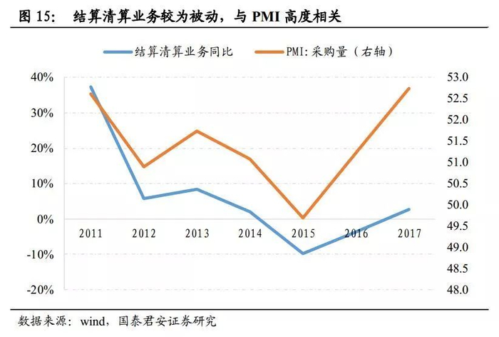 结算清算的收入相对被动,主要驱动因素是经济景气程度。这是因为,该业务与实体经济的支付活跃度相关,而支付活跃度反应了经济活跃度。因此,可以发现结算清算业务的同比增速与PMI呈同向运动。
