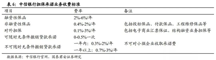 以中信银行为例,各项业务收费如下,仍然是按照融资规模和时间进行收费。其中,贷款承诺按时间长短不同的费率标准,就体现了资本的机会成本。