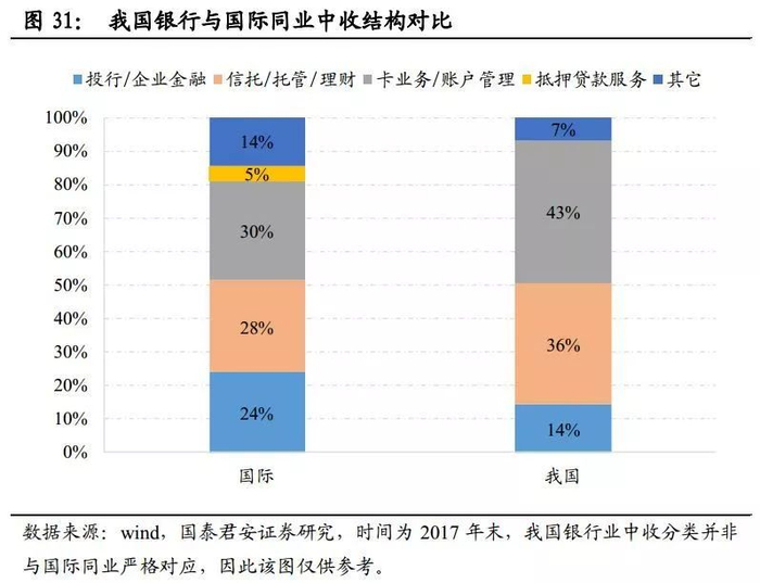 (1)将非利息收入代替中间业务收入,产生口径差异。非利息收入中包含投资收益和其它业务收入,该部分并非严格意义上的中收。国外大型银行已经有了成熟的投资经验,因此投资收益占比显著高于我国银行业,2017年五大国外样本银行的投资收益占营收比重为12.8%,而我国五大行占比仅2.0%。因此仅这一口径误差,就使得中外银行的中收占比差距拉大了10pc;