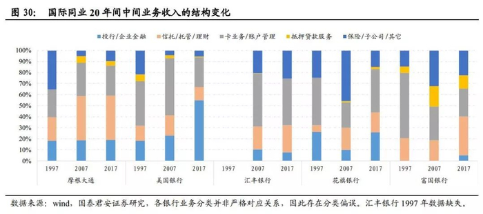 我们进一步考察,国际银行业在中间业务收入的结构上经历了怎样的变化。结果呈现出两大特点: