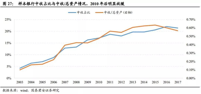 而在2008年金融危机爆发后,经济基本面面临衰退风险,虽然依靠“四万亿”计划短期内支撑了GDP增速,但自2011年开始,GDP增速长期下行的趋势已然显现。政策层面也明显转向,不再强调金融创新,反而更加强调对风险的防控,中间业务乱收费的问题也自2012年开始重点处理。在此背景下,中收增速显著放缓,中收占比由2011年的19%微幅提升至2017年的21%,中收/总资产指标则在2017年末又回到了2011年水平。