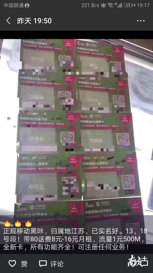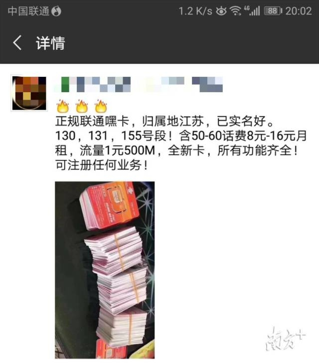 记者翻看该卖家的朋友圈发现,其内容均为贩卖各类实名电话卡的信息,称“可提供江苏移动13/18号段、浙江电信13/15/18/19号段、北京移动13/18号段、江苏联通130/131/155号段的已实名注册电话卡售卖”,不过没有标注价格。