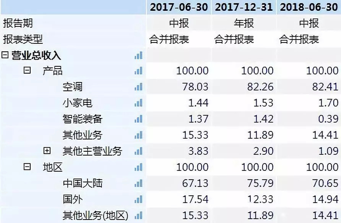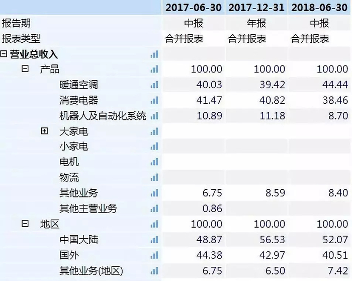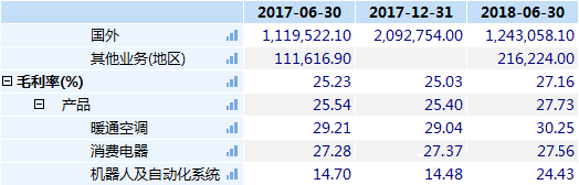 从2018年上半年收入拆分看,暖通空调、消费电器、机器人板块收入为639、553、125亿元,同比分别+27.7%、+6.7%、-8.1%,占比分别为44.4%、38.5%、8.7%。