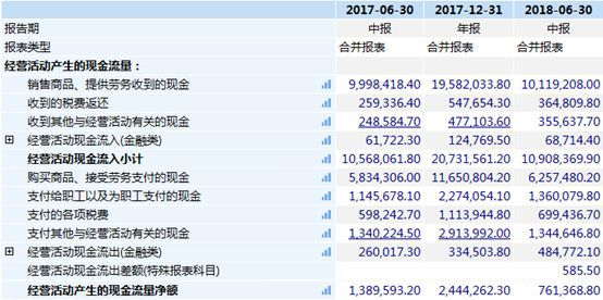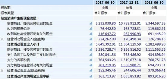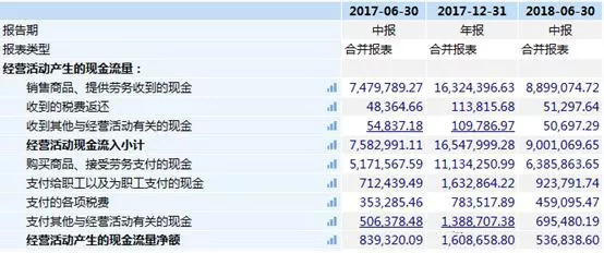流入增长3.2%而流出增长10.6%,综合导致现金流净额同比减少45.2%,其中销售商品收到的现金同比仅+1.2%是主要原因,背后反映的是公司当期销售收到了更多的票据(应收票据同比+54.1%)。