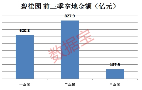 碧桂园等房企拿地金额出现骤降迹象。今年以来,碧桂园累计拿地金额高达1587亿元,而三季度只有137.9亿元,出现大幅下降迹象。具体到各季度情况看,其一季度拿地金额达620.8亿元,二季度拿地金额高达827.9亿元。