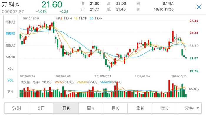 拿地依旧生猛的万科,为何高喊“活下去”?其显然已感受到行业寒意。近期公司发布公告,2018年9月公司实现销售金额434.2亿元,同比下滑6%;实现销售面积302.5万平,同比增长11%。相较此前的高速增长,目前的负增长相当刺眼。此外,股价表现也不尽如人意,万科A股近两个交易日跌去10%,今年以来股价累计下跌近三成。