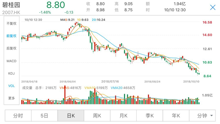 碧桂园的股价表现更差,今年以来跌幅近4成,最高点以来已经腰斩。公司销售情况也面临压力,增速回落明显。根据公司公告公布的数据,2018年1-9月实现权益销售金额4155.8亿元,环比增长9.7%,同比增长38.4%。