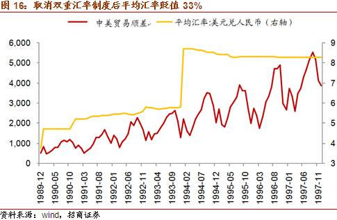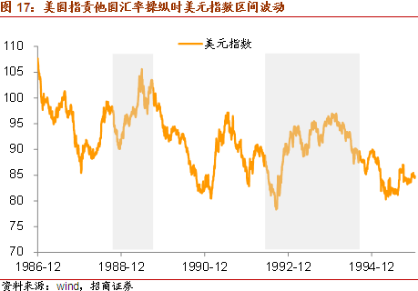 如果观察历史会发现一个有趣的现象,即被认定为汇率操纵的货币并不是出现在典型的强美元周期,1988年10月-1989年10月,美元指数在90-105之间区间波动,1992年5月-1994年7月,美元指数在85-95之间区间波动;韩元、台币、人民币也并不是处于贬值之中,人民币汇率基本保持平稳,而韩元、台币则处于升值之中,但美国会计算更长时期各个主要出口国货币的累计升值、贬值幅度与原因,外汇储备的变化幅度、贸易顺差占GDP的比重、对美国的贸易差额情况等;此外,美国财政部也非常关注外汇市场现存的限制和制度性的变化,1994年人民币虽然大幅贬值,但因汇率制度的改革而摆脱了汇率操纵国的认定;从结果而言,被认定为汇率操纵之后,贸易顺差承压。