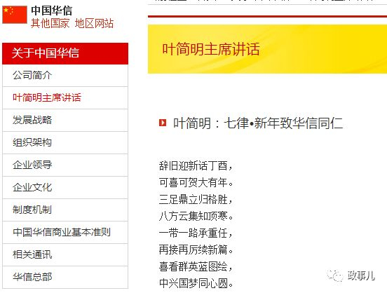 在华信官网首页,头条为“叶简明主席讲话”。该栏目中有多篇叶简明的讲话或摘要。置顶的一篇,为他在2017年12月30日作的一首七言诗《七律——新年致华信同仁》。