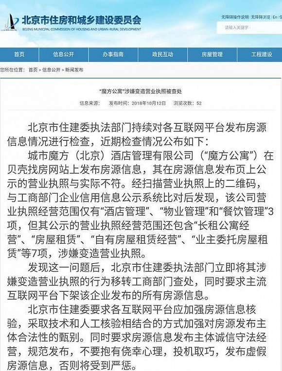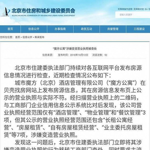 发现这一问题后,北京市住建委执法部门立即将其涉嫌变造营业执照的行为移转工商部门查处,同时要求主流互联网平台下架魔方公寓发布的所有房源信息。