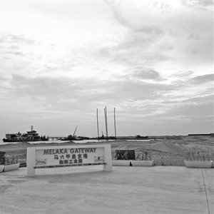 在距马六甲海峡石碑不远处,填海工程正在加紧施工。2017年,中国电建获得了价值3.5亿美元的填海造地合同,负责皇京港项目三个人工岛的吹填、护岸、防波堤工程的设计、采购及施工。