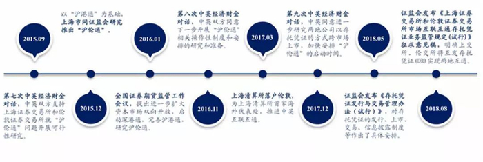 2015年10月习近平主席访英,在第七次中英经济财金对话中,双方协商将通过上海证券交易所和伦敦证券交易所上市公司互相以存托凭证方式到对方市场挂牌上市的业务模式实现两地市场互联互通。