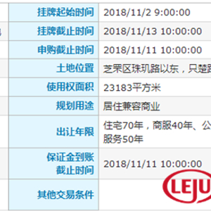 本次国有建设用地使用权挂牌出让公告期为: 2018年10月13日至2018年11月1日; 挂牌出让期为:2018年11月2日9时至2018年11月13日10时。