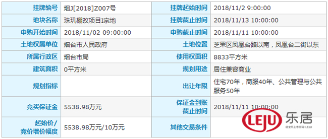 烟J[2018]Z007号珠玑棚改项目I宗地,位于芝罘区凤凰台路以南、凤凰台二街以东,土地面积8833平方米,住宅、商服、公共管理与公共服务,容积率≤2.5且>2.0,规划建筑面积≤2.20万平方米,出让起始总价5538.98万元,起始楼面价2518元/平。