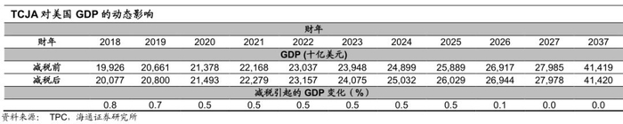 今年美国经济回升的主要原因在于,经济复苏时期采取减税措施带来了超预期刺激。经过多年的货币宽松,美国经济原本就已处于上升周期,2010-2017年实际GDP年均增长达到2.1%,2018年正常情况下也有望稳定增长。而今年美国实施了减税措施,则使得经济复苏强度超预期。根据美国税务政策中心(TPC)的测算,考虑到对总需求、劳动供给、储蓄和投资的综合影响,本轮的减税政策(17年底通过的减税和就业法案,简称TCJA)实施后,在2018财年将提升名义GDP达0.8个百分点。