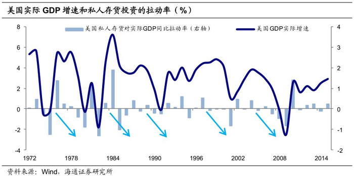 存货投资在美国经济中虽然占比不高,但往往是一个领先指标,因为它与美国经济的库存周期紧密联系在一起,过往的数据也都显示在经济转向衰退之前,库存投资通常率先出现下行。