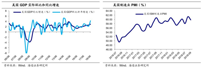 今年以来,美国经济整体保持了强劲的复苏。2季度美国实际GDP环比折年增速达4.2%,实际同比增速回升到2.9%,分别是14年4季度和15年3季度以来的新高。而今年以来美国的ISM制造业PMI也一直维持在60附近的高位。