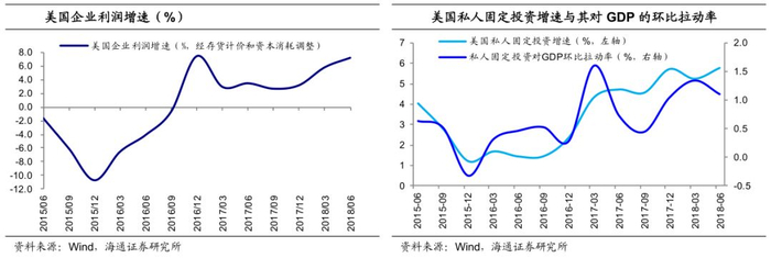 而实际的经济数据也印证了今年减税的效果。本轮美国的减税措施大体可以分为企业税和个人税两方面。对于企业税,所得税率的大幅降低提升了企业利润,进而也推动了私人投资的增长。据TPC测算,大企业所得税率大幅下调至21%,本轮减税政策在未来十年或可减少企业应缴税额近2万亿美元。从今年的数据看,2季度美国企业利润增速达7.3%的较高水平。加之设备投资一次性费用化、鼓励海外利润回流等的贡献,2季度美国私人固定投资实际同比增速达5.8%,环比增速6.4%,对GDP环比拉动1.1个百分点,均处于历史较高位置,显示减税刺激投资的效果良好。