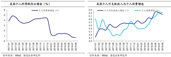 而对于个人税,减税提升了居民的个人可支配收入,从而也推动了消费的增长。据TPC测算,18年减税实行将使美国个人平均税后收入提升2.2%。从实际数据来看,自年初减税法案施行以来,美国个人所得税季调折年同比增速从去年的4%以上大幅下降到了1%以下,而同时期,美国个人可支配收入和个人消费增速稳步上升,8月分别达到5.2%和5.3%的高位。可见,减税对居民消费的刺激也十分显著。