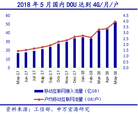 2015~2018年间,国内移动互联网市场规模呈现加速增长趋势。2018年5月,DOU(平均每户每月上网流量)值达到3.97GB,同比增长169.3%,增速较上月提高15.4个百分点,DOU值接近日韩等通信发达市场。