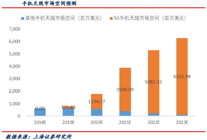 结合5G手机出货量预测,上海证券给予2021~2023年手机单机价值量的假设参数分别为4.5美元、4美元和3.8美元,假设其他手机的天线单机价值0.4美元,则对应年份手机天线市场空间为38.80亿美元、53.00亿美元、62.70亿美元,5G手机天线市场分别为35.00亿美元、50.82亿美元和61.56亿美元。