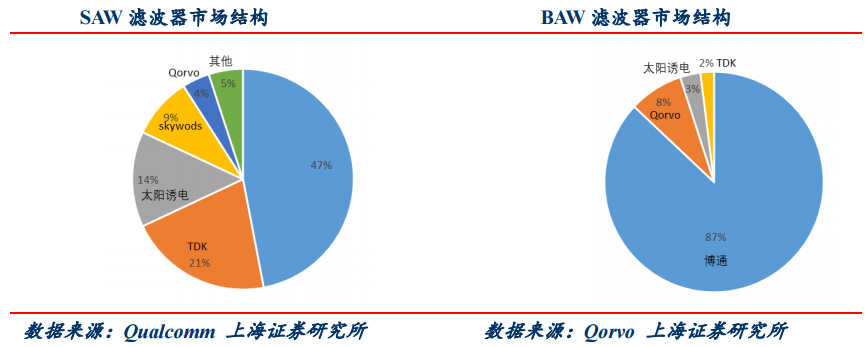 5G对滤波器的影响主要包括:①5G频段数量提升、载波聚合(CA)技术增加滤波器用量;②5G频段频率提高加速表声波滤波器(SAW)向体声波滤波器(BAW)技术路线升级。
