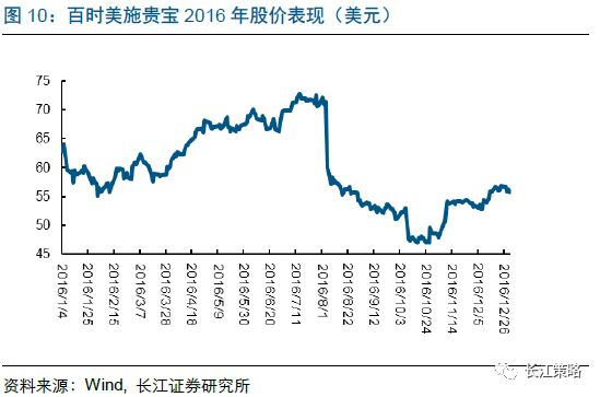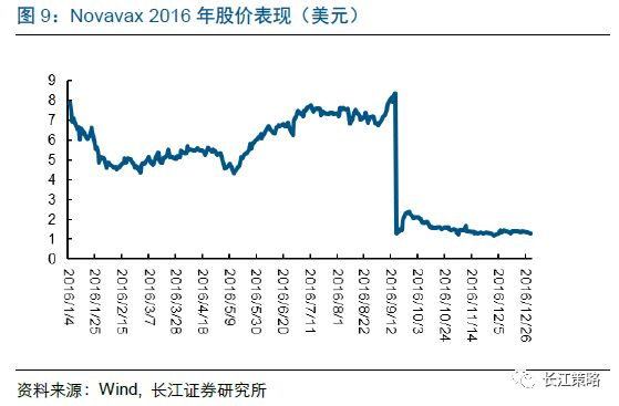 这样的例子也是比较常见,都带来了股价大幅下跌:2016年8月份,百时美施贵宝Opdivo(肿瘤免疫治疗药物)在关键III期临床试验中失败,公司股价从70.43美元跌至59.58美元。由于研发失败事件;Novavax RSV病毒疫苗3期临床试验中表现并不成功,疫苗3期研发失败。RSV 疫苗在老年患者市场的表现是公司的主要价值驱动因素,这一事件对公司股价造成严重影响,从8.34美元暴跌至1.29美元。