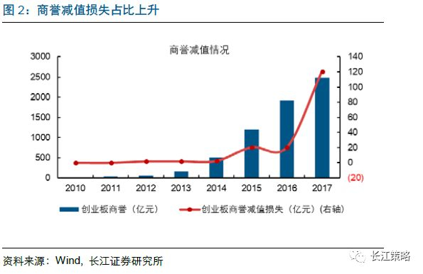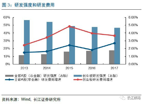 衡量成长性公司的成长性基本上从内生和外延两个部分。公司的外延动力和其兼并重组的行为有关,而内生动力和企业的研发创新有关。2013年以来,A股上市公司进行了大量的兼并重组,但由于定增新规的影响,并购重组的规模有所下降,以创业板为例,2017年创业板的重组金额有明显下降,这很大程度上制约了企业的外延并购活动,同时外延并购活动还带来了其他负面影响,商誉减值就是其中之一,一旦业绩不及预期则严重影响相关公司业绩。综上,在外延并购活动受限以及商誉减值风险的双重影响下,研发或成为当下衡量成长类公司的成长性的最重要因素。