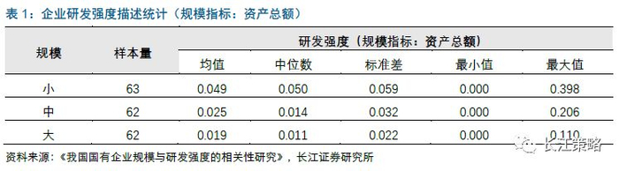 根据中国的情况,有学者对于中国央企在A股上市公司及子公司所披露的年报从销售收入、总资产和研发强度来分析这些因素之间的内在关系 ,将2013年样本企业依据资产总额和销售额排序并划分为三等分,根据这一办法可以得到下表: