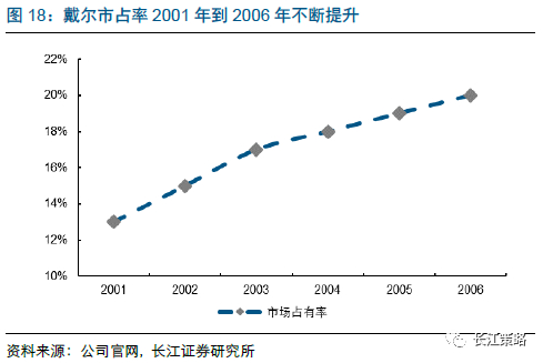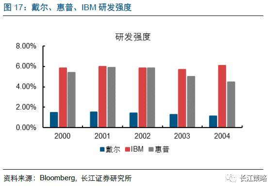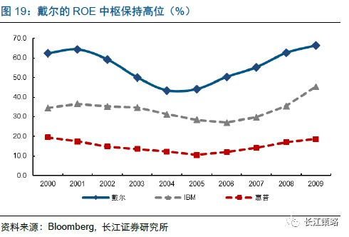 由于个人电脑行业的大部分变革都是由零部件供应商和软件生产商引起的,英特尔和微软等对新一代处理器和软件投资几十亿美元进行开发,戴尔公司出于竞争格局和战略考虑,实施选择性研发,使其能够最小化研发成本并且获得高额的投资回报。相比同时期的惠普和IBM,戴尔无论从研发的绝对金额还是研发强度来看,都明显低于其竞争对手。在个人电脑市场盈利潜力较低的背景下,戴尔公司并没有因为其研发强度较低而处于劣势,其盈利能力在同期远超另外两家公司,并且市场占有率不断提升。在当时个人电脑盈利能力较低的情况下,其盈利水平突出,ROE中枢水平一直高于IBM和惠普。