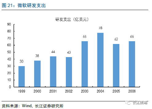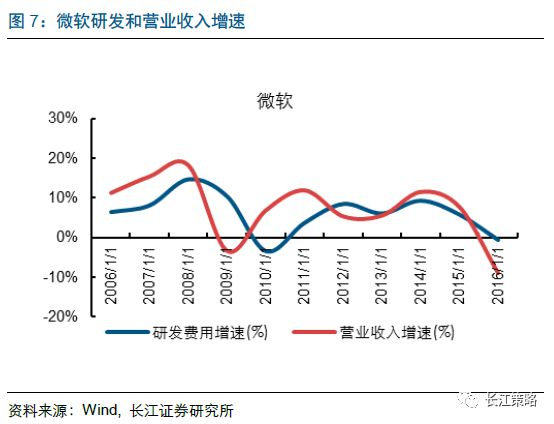 研发费用和营收谁为因谁为果?上市公司的研发费用增速和营业收入增速具有一定的一致性,营业收入增速略微领先于研发费用增速,在营收上升之后都有意愿进行研发投入,而非逻辑倒置。以微软为例,研发费用增速滞后于营业收入一年左右,高通的研发费增速也与营收增速较为一致。