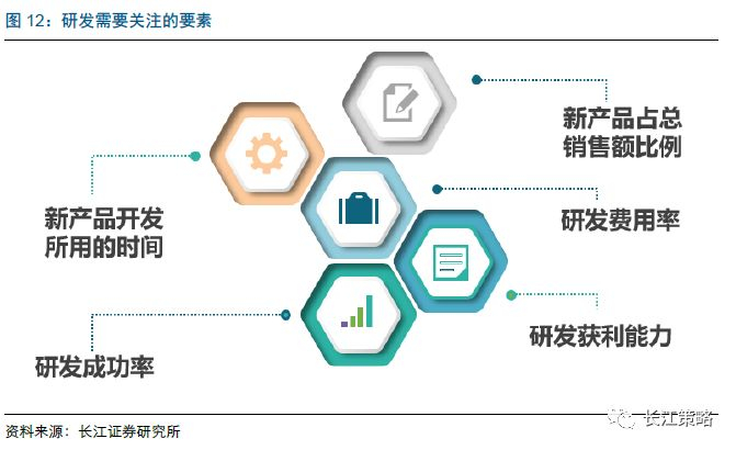 每年通过预测或者分析财报得到每年的研究费用和拥有的研发人才这类型的数据,其实只能得出一个粗略的指导,无法清晰判断这家公司是否拥有一个优秀的研发部门。需要关注的点有很多,如:是否有足够的销量来回收研究成本;是否能够较低成本批量生产;管理层是否会由于一些期限计划打断正常的研究项目等等。投资者需要关注的指标可能比想象中更多,如新产品研发所需要的时间、研发成功率、研发出的新产品占总销售额的比例、研发费用率、研发的获利能力等等。