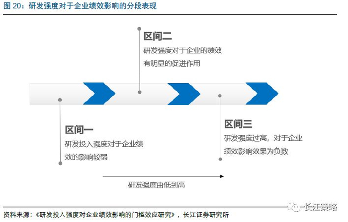 这是由于研发强度过低,其技术含量不高,越容易被模仿,所以企业也较难从较低强度的研发中获益;而过高的研发强度一则很难持续,二则会带来很高的机会成本,挤占其他方面的投入。根据《研发投入强度对企业绩效影响的门槛效应研究》对2005年-2007年国有企业以及主营业务在500万元以上的非国有企业作为研究样本,以研发费用/销售收入来衡量研发强度,用资产收益率来衡量企业绩效,得到如下结论:高技术行业研发强度的第一门槛是1.1%,即研发支出/销售收入为1.1%,第二门槛是4.13%;低技术企业研发强度第一门槛是0.93%,第二门槛是3.8%。并且研发强度对于企业的绩效的非线性特征在高技术行业表现更加突出,对于低技术行业,技术可能并不能构成企业核心力的来源。当然,由于样本选取的时间区间较早,所以当时对于研发的重视程度以及研发投入均远小于当前,另外采取工业企业样本(国企和主营业务收入在500万元以上的非国企)与当前A股上市公司也有较大差别,但是研发强度与企业绩效之间关系的非线性关系(“三区间”)依旧有参考意义。
