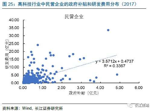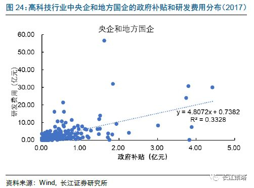 选取较高科技含量的行业里(国防军工、医药生物、电子、计算机、通信、机械、电气设备、汽车)的上市公司作为样本,区分国有企业和民营企业,可以发现,无论是国有企业还是民营企业,其政府补贴和研发呈现正相关关系(剔除极端样本);从样本散点图趋势线的系数来看,央企和地方国企的系数高于民营企业,可以简单的说明国有企业的研发支出对政府补助更为敏感。由于信息不对称,企业对于补贴以及研发的披露也并不完全,政府补助的资金用途以及对应公司的研发状况应自下而上进行研究。